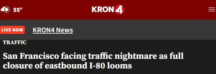湾区司机可能即将迎来一场交通噩梦,因为旧金山Interstate 80公路东向车道将于本月晚些时候进行为期整个周末的全封闭施工。