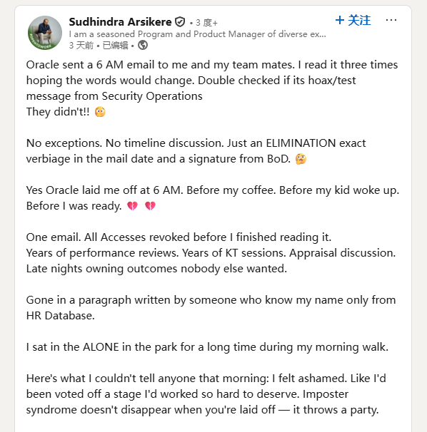 前Oracle员工Sudhindra Arsikere在LinkedIn上表示,公司在当地时间早上6点发送了这封邮件,并立刻撤销了他的所有访问权限。