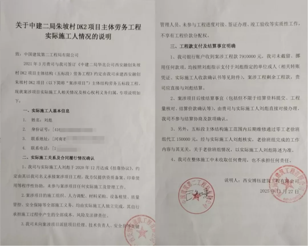 刘彪称,2020年12月、2021年3月,在中建二局华北公司领导的推荐下,先后和西安博钰建筑工程有限公司、北京盛悦华宇建筑工程有限公司口头达成“挂靠协议”,支付管理费。两家公司随后与中建二局签订劳务工程合同,约定由刘彪负责朱坡村DK2项目主体五、六标段施工。