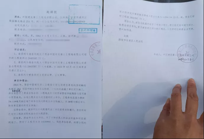 然而,让刘彪感到意外的是,2026年3月23日他收到了西安法院传票,中建二局起诉了他,让其返还超付的280万元工程款及利息。