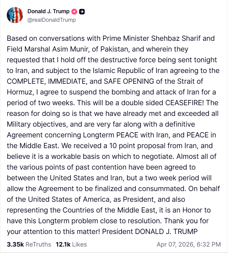 美国总统特朗普4月7日在社交媒体发文说:“基于与巴基斯坦总理谢赫巴兹·谢里夫和陆军元帅阿西姆·穆尼尔的会谈,他们请求我暂停今晚向伊朗派遣的破坏性力量,并假设伊朗伊斯兰共和国同意立即、全面、安全地开放霍尔木兹海峡,我同意暂停对伊朗的轰炸和攻击两周。这将是一项双向停火!这样做的原因是,我们已经达到甚至超过了所有军事目标,并且在与伊朗达成长期和平协议以及中东和平协议方面取得了重大进展。”