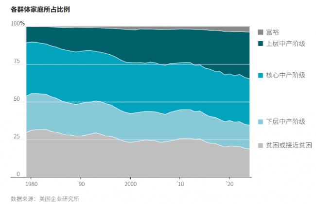 美国企业研究所的报告按收入水平将家庭划分为五个不同群体。其中三个群体属于中产阶级:下层中产阶级、核心中产阶级和上层中产阶级。