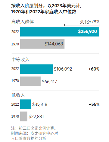 皮尤研究中心将高收入群体定义为收入超过中位数家庭收入两倍的人群,这意味着,2024年一个三口之家的年收入需要达到约20万美元或以上。虽然经通胀调整后,所有群体的收入都大幅增长,但富裕家庭的收入增长要快得多。