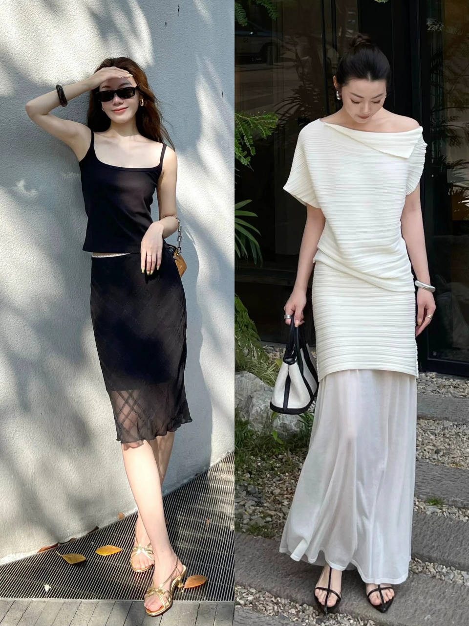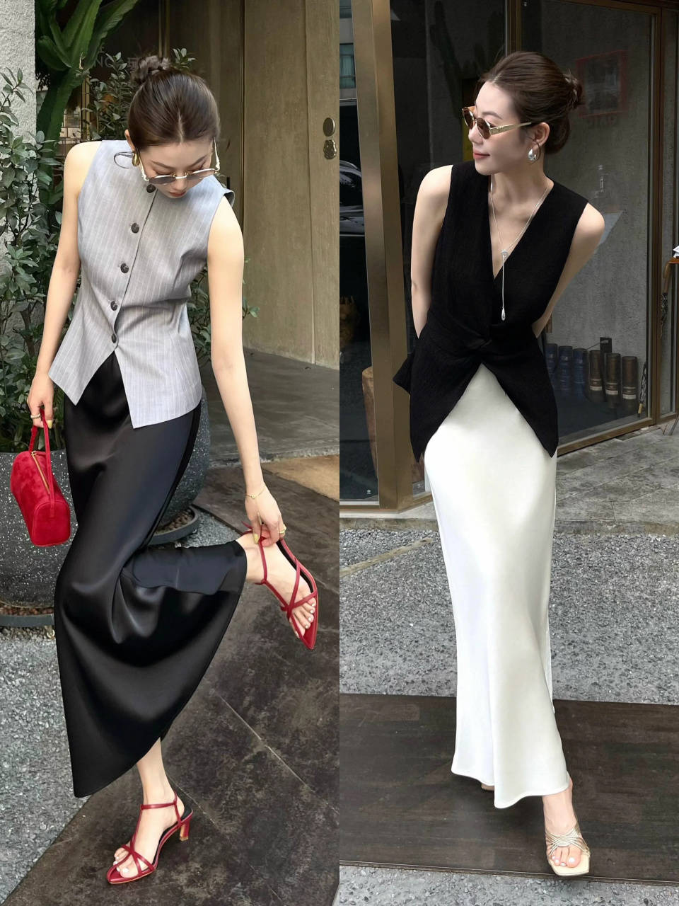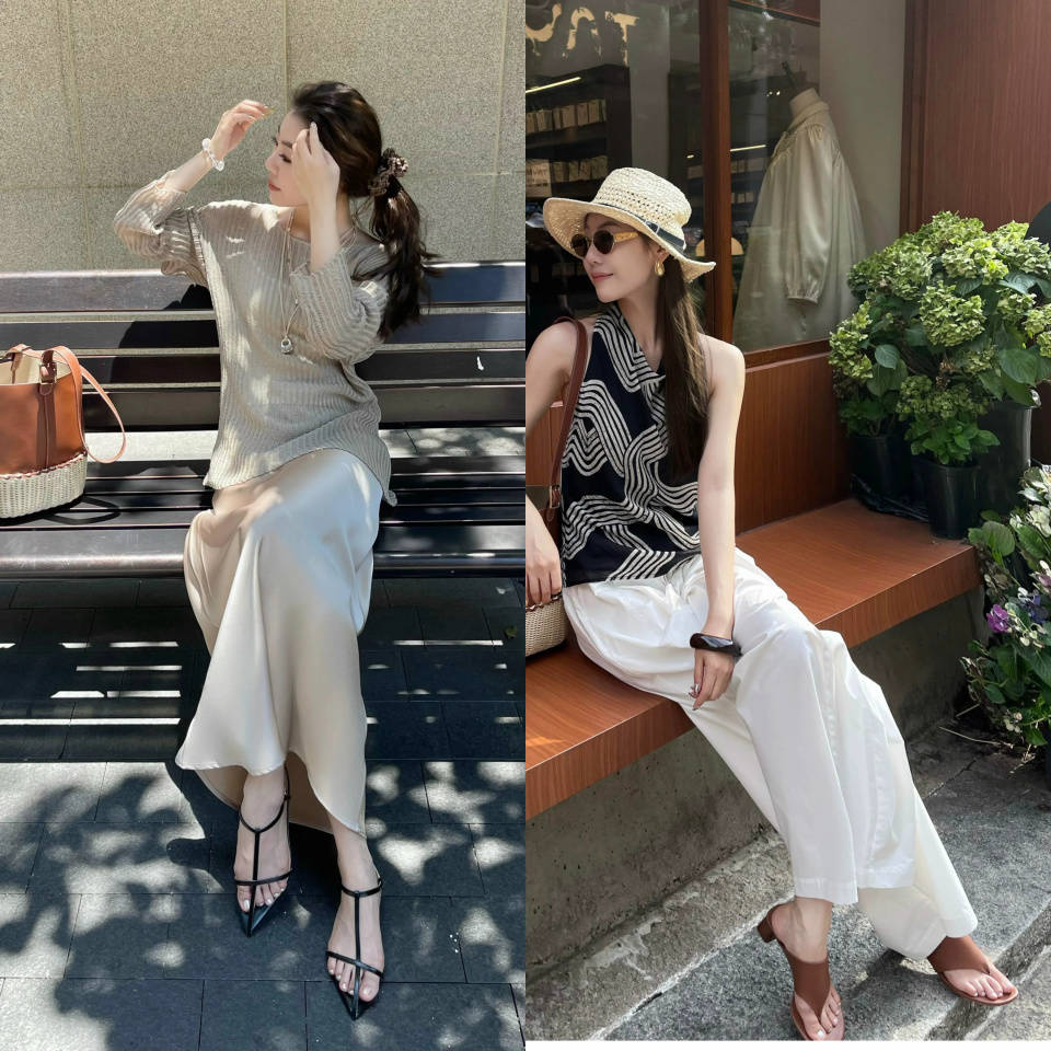 当然我们也可以选择一双银灰色的高跟凉鞋,配上白色的直筒半裙和 V 领的黑色无袖上衣,自带温柔优雅气质。