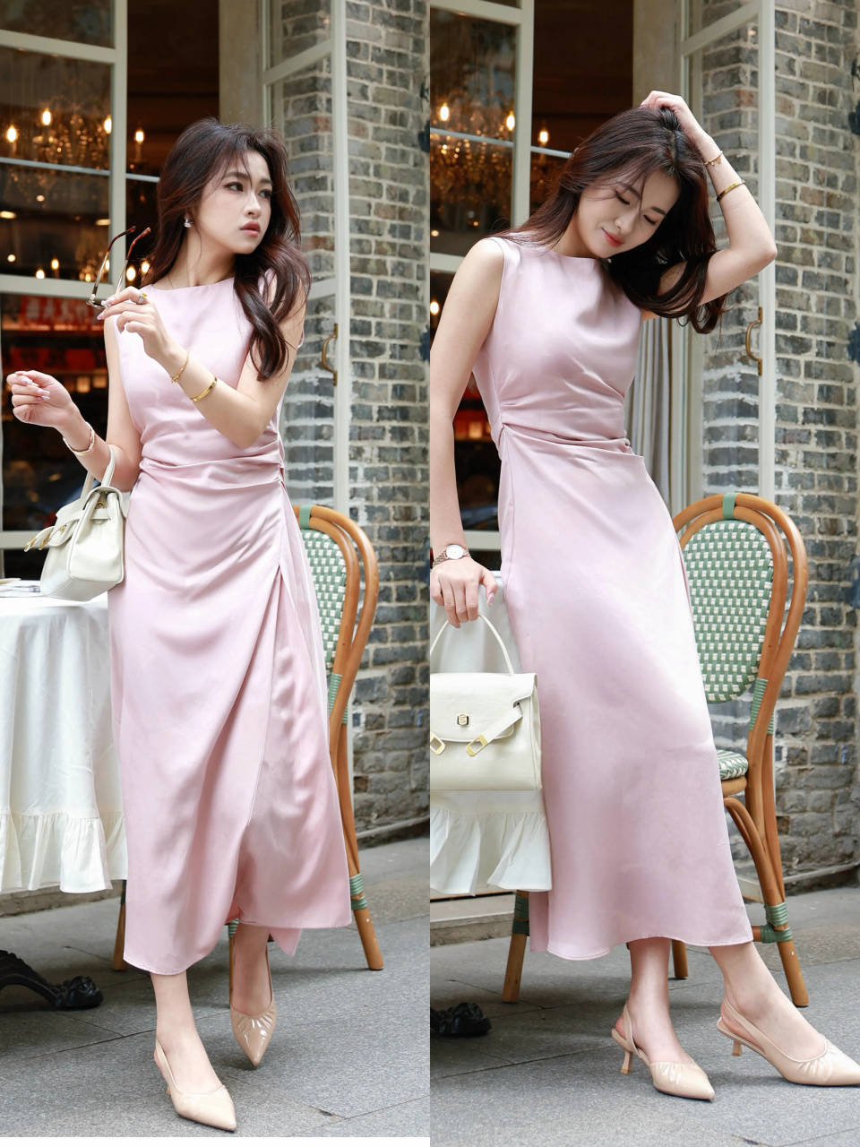 若是上班穿搭,不妨可以选择一条浅粉色的无袖连衣裙,穿在身上少女感自显,再配上一款杏色的低跟浅口尖头单鞋,给造型注入了高级感,增强你的气场。