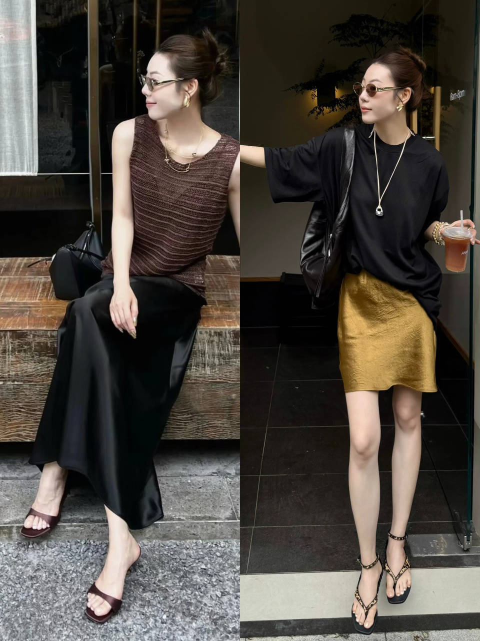 例如用黑色吊带配黑色直筒半裙,脚踩一双粗跟凉鞋,轻松勾勒出清甜的少女感。