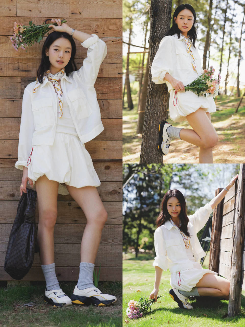 年轻貌美的你,想要增加造型的活力感与个性,可选择一双白色,黑色,黄色三色拼接的运动鞋,搭配白色的夹克裙装造型自带春日少女氛围感,使得穿搭者活泼又洋气。