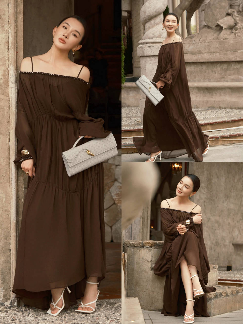 就算喜欢穿高跟凉鞋,咱们也要控制小于 6cm 的鞋跟,穿在脚上稳定性更好。例如上面这一双白色的高跟凉鞋,搭配上棕色的一字肩连衣裙,整体穿搭优雅又精致。