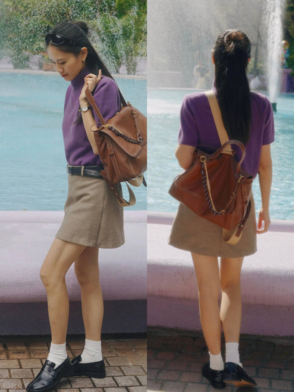 日常通勤穿搭,不妨选择一双黑色的皮鞋,平底的鞋子穿在脚上不累脚,走起路来稳定性更好。加上一条燕麦色的短裙和紫色的针织上衣,清新大气又减龄又不失精致感。