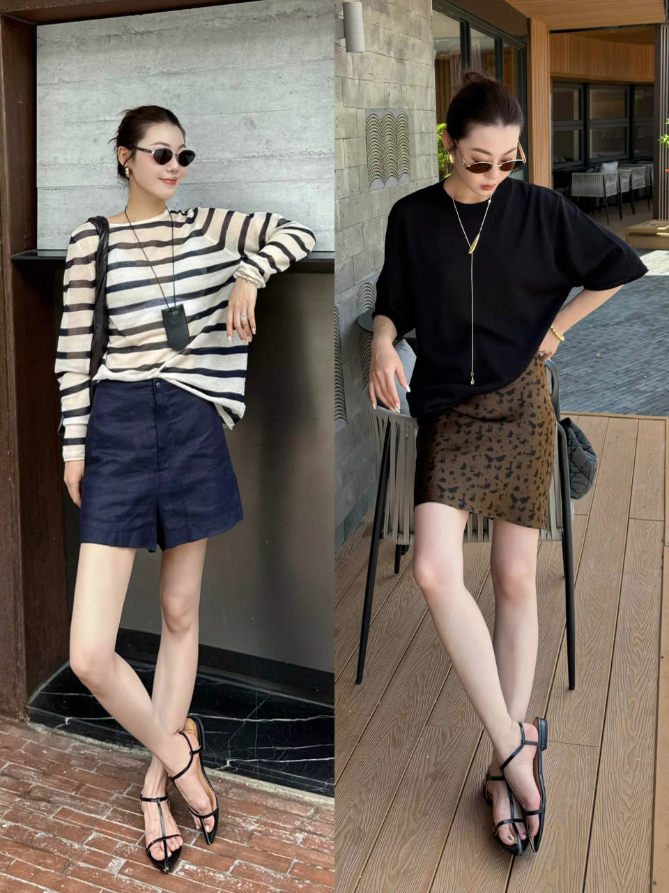 穿上一双凉鞋,颜色尽量选纯色系,黑白灰基础色调百搭耐看,棕色美拉德色系穿在脚上更显高级。不穿花哨的鞋子色彩,降低出错率。