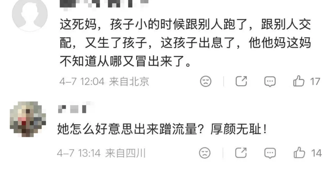 评论区几乎一边倒:孩子住土坯房、奶奶拉扯长大,你这个当妈的早年一走了之,如今儿子出息了,倒回来写什么“妈妈的心里话”?就是蹭热度,厚颜无耻。