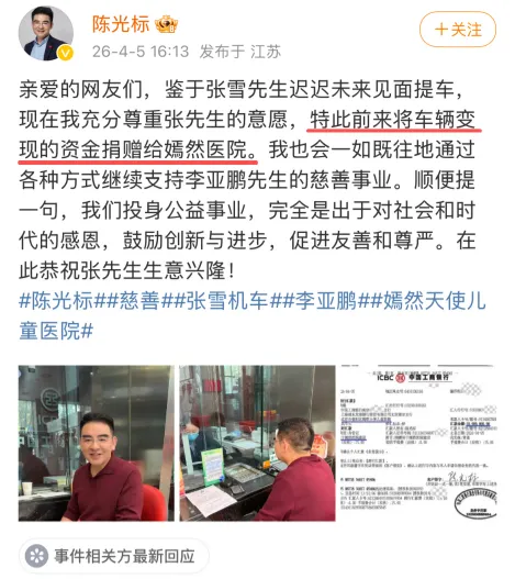 他说:“鉴于张雪先生迟迟未来见面提车,现在充分尊重张先生的意愿,特此将车辆变现的资金捐赠给嫣然医院”。