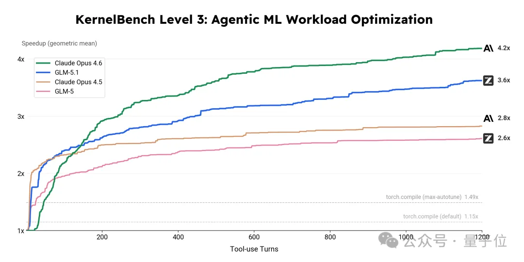 从这个过程中可以看到,GLM-5.1能够自主编写定制Triton Kernel和CUDA Kernel,运用cuBLASLt epilogue融合并实施shared memory tiling与CUDA Graph优化。