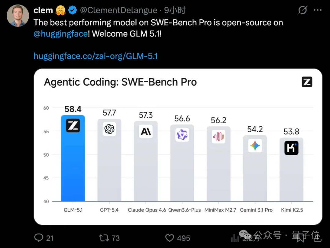 HuggingFace CEO也出面站台,称SWE-Bench Pro中性能最强的模型开源了: