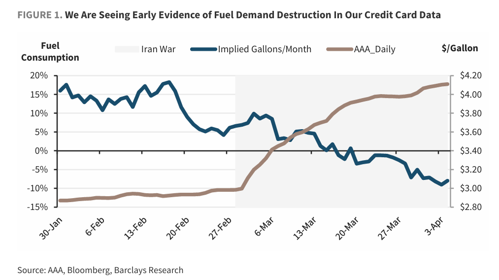 战争初期曾短暂出现加油频次上升的反常现象。分析师认为,这可能源于部分消费者预期油价将继续上涨、选择提前"加满"以规避成本上升。但随着战争持续,这一效应逐步消退,加油频次随之稳步下滑并转为同比负增长。两项指标合并来看,巴克莱认为足以构成美国消费者正在削减燃油消费的早期证据。