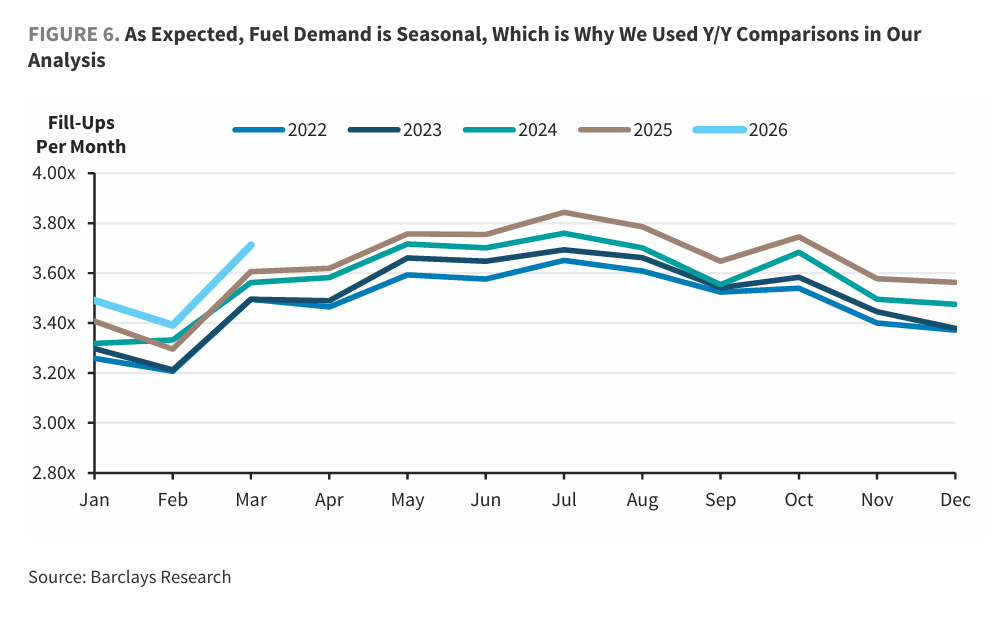 由于信用卡交易数据仅记录交易金额而非实际加仑数,巴克莱通过总支出与AAA平均零售油价推算消费量。为剔除季节性因素——尤其是从冬季向夏季驾驶旺季过渡期间的波动——分析采用同比口径。