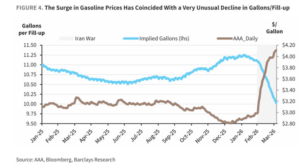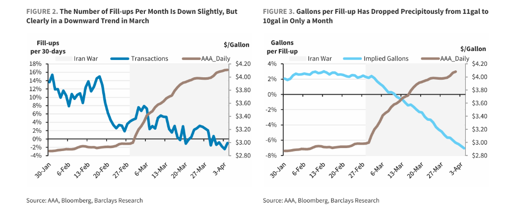 每次加油量的变化则更为触目。每笔交易隐含的加油量从历史上高度稳定的约11加仑降至约10加仑,同比下降7%。巴克莱指出,这在历史数据中属于极不寻常的变化,是消费者对高油价最直接的行为反应——在出行需求相对刚性的情况下,选择每次少加油以控制单次支出。