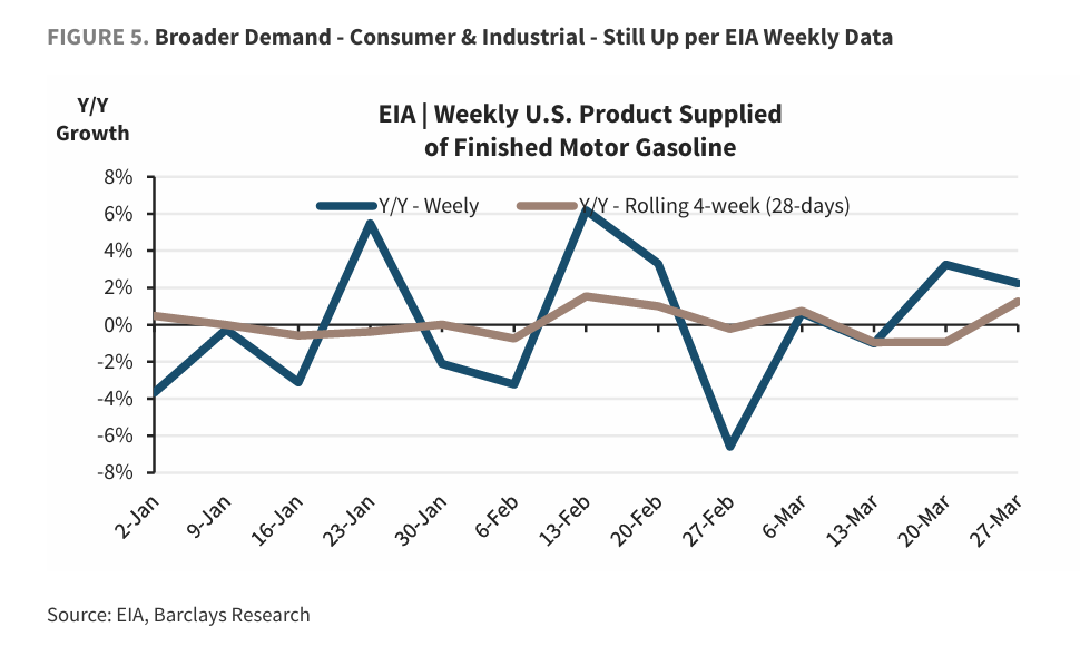 据此推算,自伊朗战争爆发以来油价累计上涨约40%,理论上对应消费者与工业端汽油需求合计下降约3%。然而,EIA截至3月27日的数据显示,四周滚动口径需求仍同比增长1%,尚未印证上述下行预测。