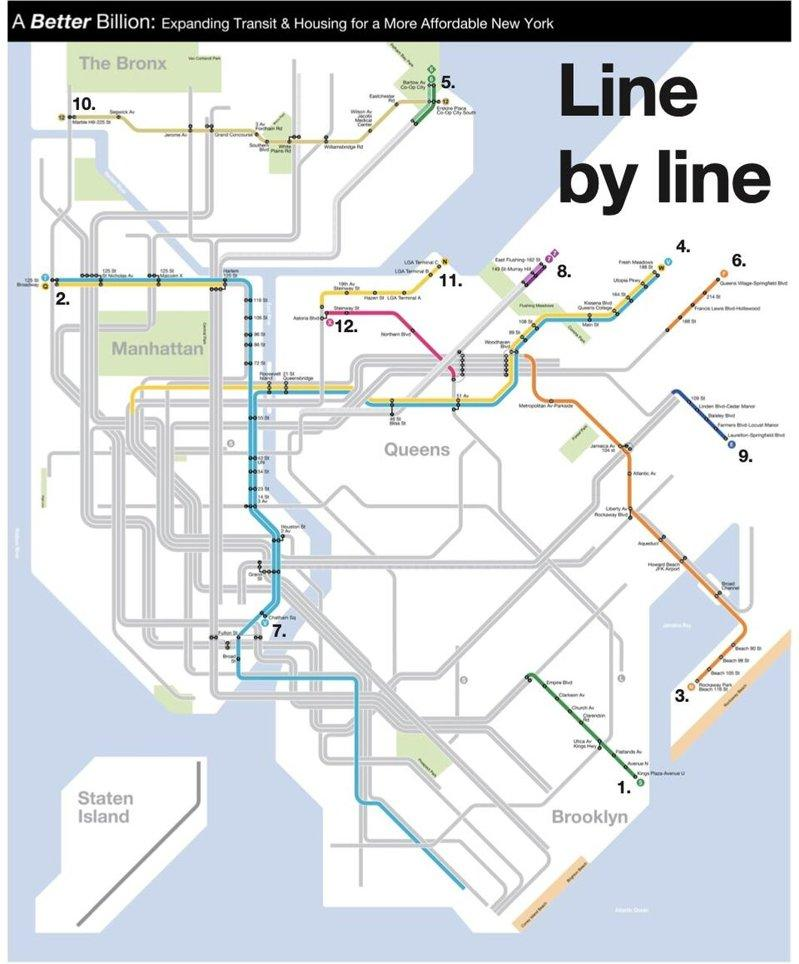在路线选择上,唐Franklin团队聚焦于「需求已存在」但被长期忽视的交通线。例如,皇后区的山边大道(Hillside Ave)每日公车乘客量达20万人次,却始终缺乏地铁覆蓋。报告将此处列为前20年的优先建设项目之中。