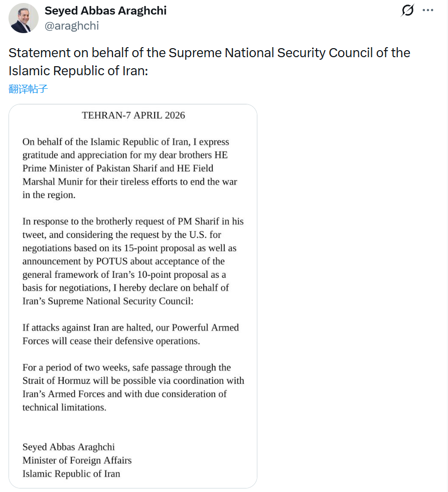 伊朗最高国家安全委员会宣布:接受巴基斯坦提议,停火两周。特朗普紧跟着在社交媒体上发文:同意暂停轰炸。至于以色列,虽然满脸不情愿,但也只能咬牙点了头。