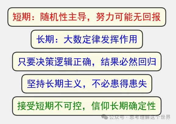 大数定律也能给我们一些哲理,不要太看重短期波动和利益而是要关注长期趋势和收益。在短期内通常随机性占据主导,努力可能没产生回报。而长期的情况下大数定律就会开始发挥作用,只要你的决策逻辑是正确的,结果必然会回归到应有的水平。我们要坚持长期主义,不必为一时的得失而患得患失。要接受短期的不可控,信仰长期的确定性。