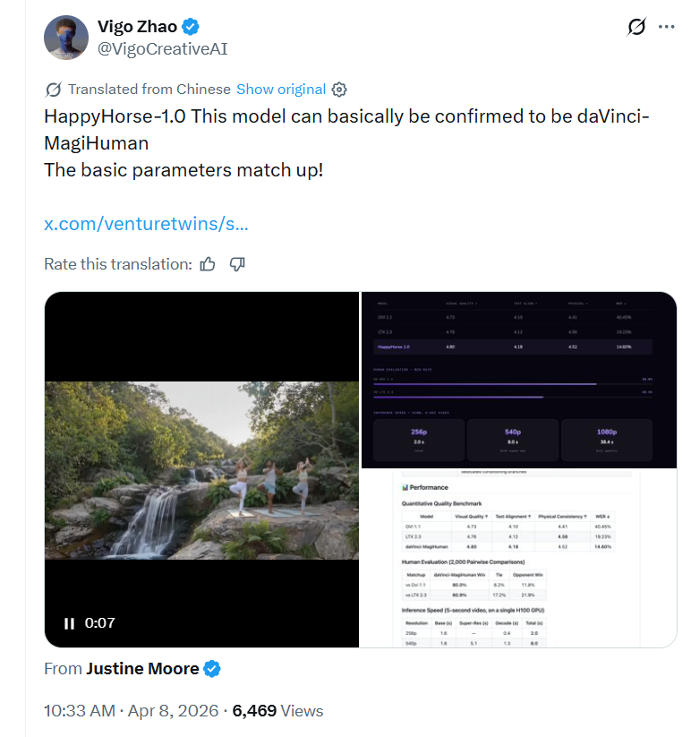 X用户Vigo Zhao把HappyHorse-1.0的公开基准数据拿去和已知模型逐条核对,找到了一个高度吻合的对象:daVinci-MagiHuman——也就是今年3月上线GitHub的开源模型「达芬奇魔法人类」。
