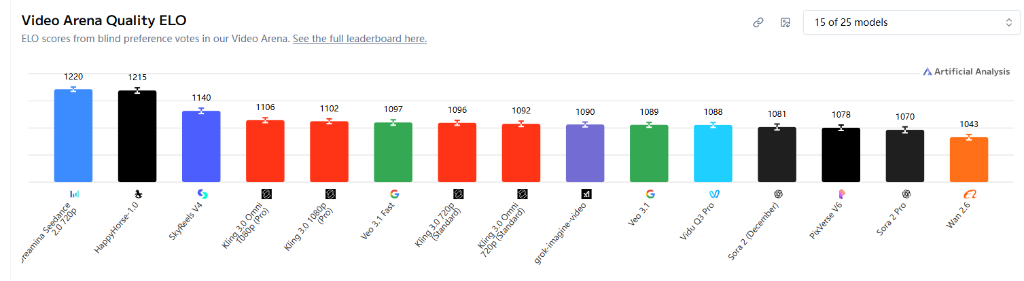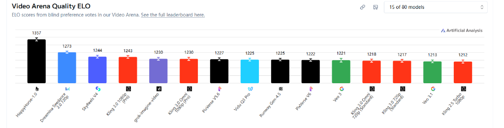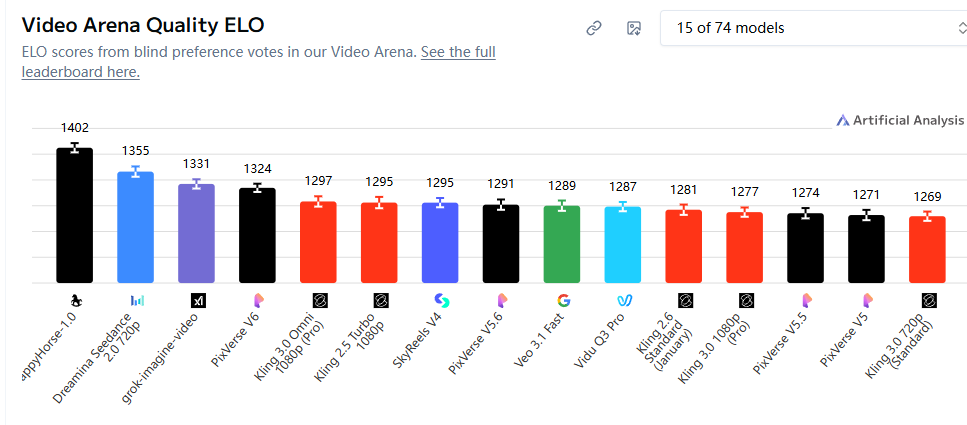 这个质疑并非没有道理。但Artificial Analysis的排名机制,决定了它比普通跑分榜更难被轻易操控——所有排名均来自全球真实用户的「蒙眼二选一」盲测投票,用户在完全不知情的情况下,对两段生成结果进行对比选择,最终汇总成Elo积分。
