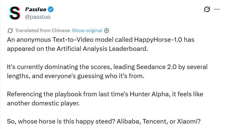 名字本身也是线索。2026年是农历马年,「HappyHorse」这个命名藏着不太含蓄的马年梗,今年早些时候「Pony Alpha」也玩过类似套路。于是嫌疑名单迅速拉长:腾讯和阿里的创始人都姓马,天然在列;有人押注小米,觉得雷军一贯低调,喜欢突然亮牌;也有人觉得气质更像DeepSeek,毕竟DS此前曾悄悄上线过视觉模型,后来又悄悄下线了。