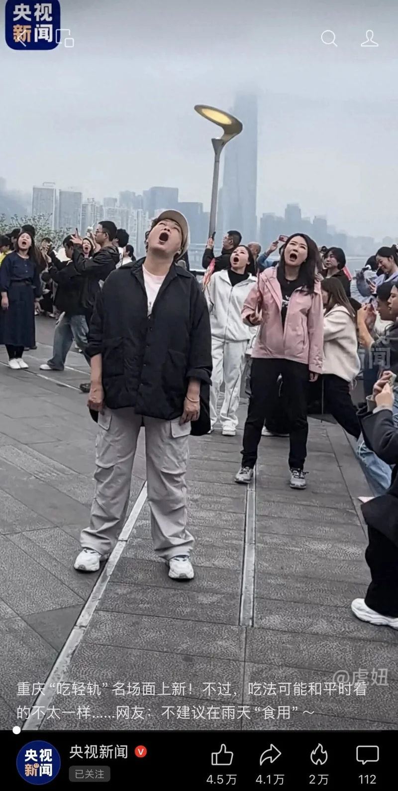 日前,一段成群的游客在重庆李子坝抬头张着嘴“吃轻轨”的视频走红网络。