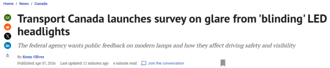 不过,他补充说,任何改革都很难快速实现。车灯眩光、或至少是越来越亮的问题,确实成了加拿大人关注和讨论的热门话题。仅交通部 3 月中旬关于本次调查的社交媒体贴文,就收获了超 1700 个点赞、1500 条评论和 1900 次转发,而该部门其他发文几乎无人问津。