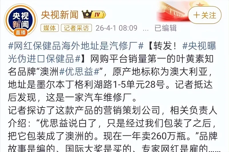 央视的调查一出来,不少人都看愣了。那个在与辉同行直播间被反复强调“澳洲原装”、“TGA认证”的优思益,所谓墨尔本总部,其实是家汽车修理厂。