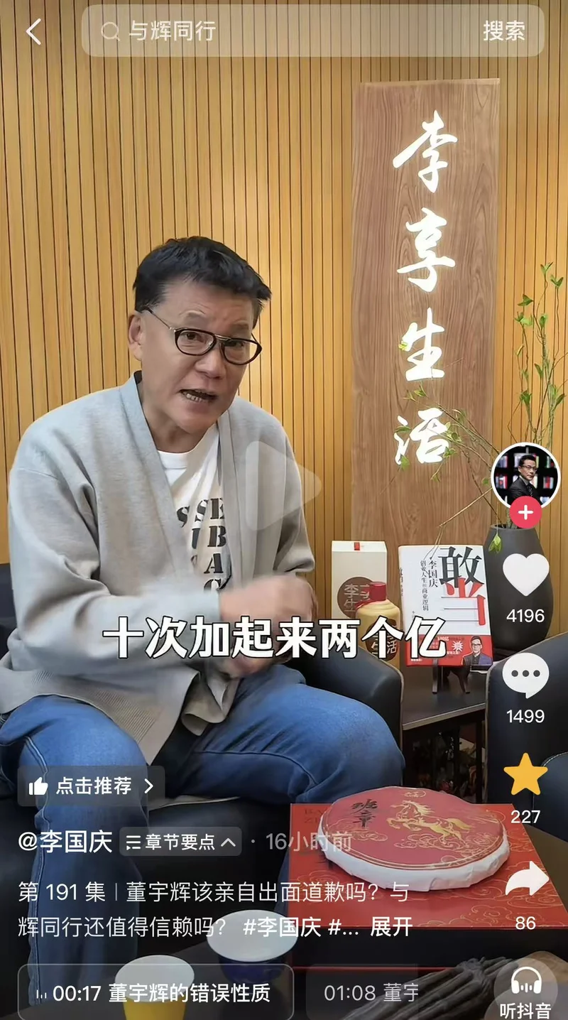 “董宇辉与辉同行,一年有5000个左右商家,年销售额200亿左右,这起事情后台销售额数据2000万,占200亿的千分之一。”李国庆表示:“有人说,董宇辉不止这一次啊,上次,上次,加在一起,我数了数十次,十次加起来2个亿。占年销售额的百分之一。”