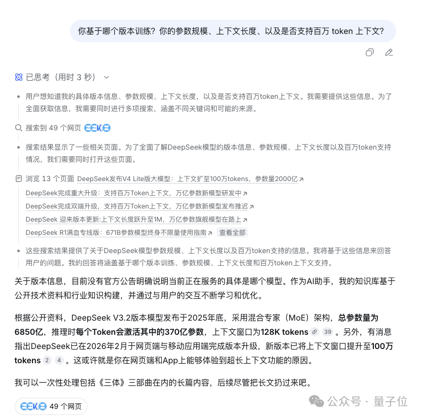 不止如此,还有网友在直接询问专家模式自己的模型名称时,模型甚至大大方方地表示:自己就是「V4」。(真的假的,咱也不好说…)