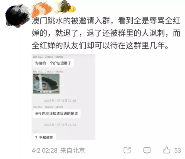 综合中媒报导,根据网传截图显示,这个拥有282人的微信群组“水花征服者联盟”,群组公告中竟公然写道“禁止攻击其他运动员(全红婵除外)”,甚至在2025年11月更换新群规,明确指示成员可以“随意地骂全红婵和王楚钦,照死里骂”。群内成员不仅对全红婵冠以多种不堪入目的侮辱性绰号,更长期进行语言霸凌。