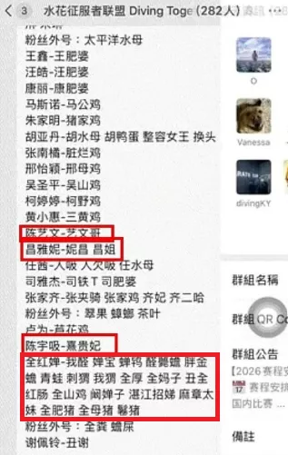 爆料指出,该群组的成员身分非同小可,包括多位中国知名跳水运动员如陈芋汐、昌雅妮、陈艺文、龙道一、杨健等,甚至连央视体育记者杨烁、跳水国际裁判饶琅以及运动员家属也都在群组内。尽管成员间彼此知晓身分,却无一人对群内的霸凌言论提出制止。据传一名澳门跳水运动员因看不下去而退群,竟也遭到群内成员的集体攻击。