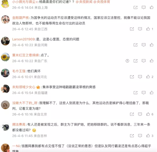 网友也怒批,“这已经是国家队层面的超级大丑闻了。国家队运动员,代表央视发言的跳水记者,裁判,谩骂者知道他们在群里还肆无忌惮,他们的沉默对于谩骂者来说像是默许,仿佛有了靠山一般。更别提央视记者和运动员杨健是在群里发言过的。”