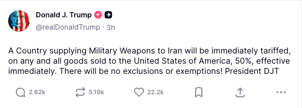 他在另一则贴文中宣布:任何向伊朗提供军事武器的国家,其所有输美商品将立即被加征50%关税,且“不设任何例外或豁免”。