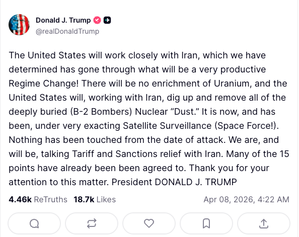据路透社4月8日报道,川普当天在其社交平台Truth Social发文称,美国认定伊朗已完成“具有建设性的政权更迭”,并宣称伊朗未来将“不再进行铀浓缩活动”。他表示,美方准备与伊朗合作,处理此前美军B-2轰炸机空袭后仍深埋地下的核设施残余物,并强调伊朗核设施始终处于美国太空军卫星严密监控之下。
