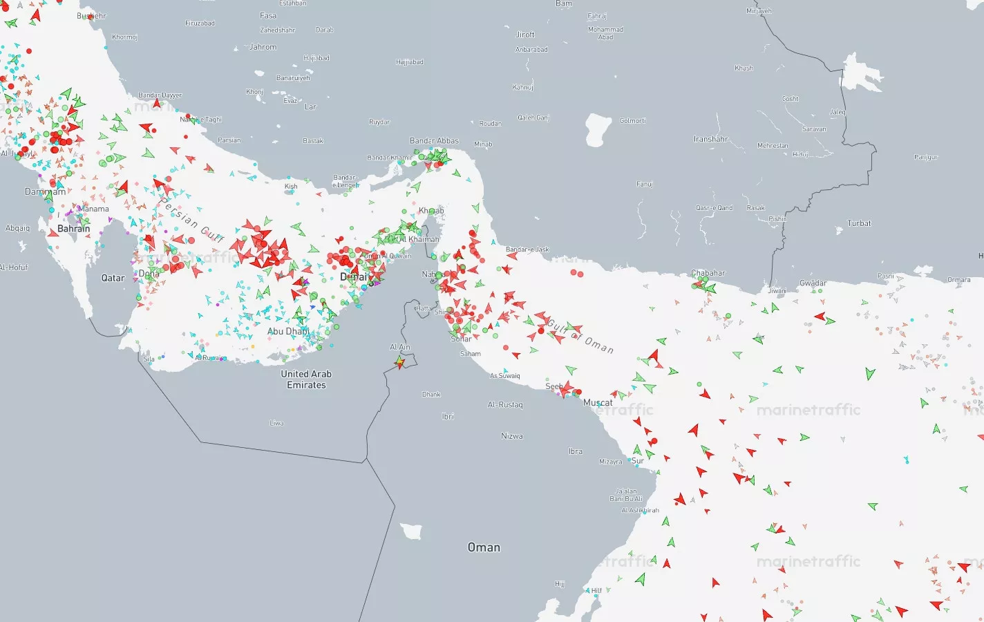 2026年4月8日,船舶追踪网站MarineTraffic显示,数百艘船只滞留于霍尔木兹海峡。(MarineTraffic)