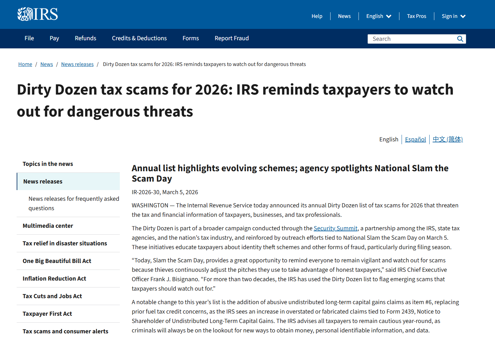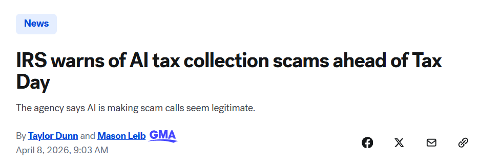 IRS在上月发布的公告中,将利用AI生成的自动语音电话列入2026年报税季“十二大常见税务骗局”(Dirty Dozen)之一。