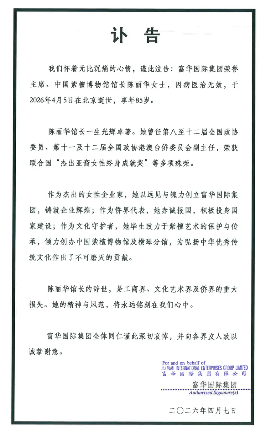 2026年4月7日,富华国际集团发布讣告:富华国际集团荣誉主席、中国紫檀博物馆馆长陈丽华女士,因病医治无效,于2026年4月5日在北京逝世,享年85岁。