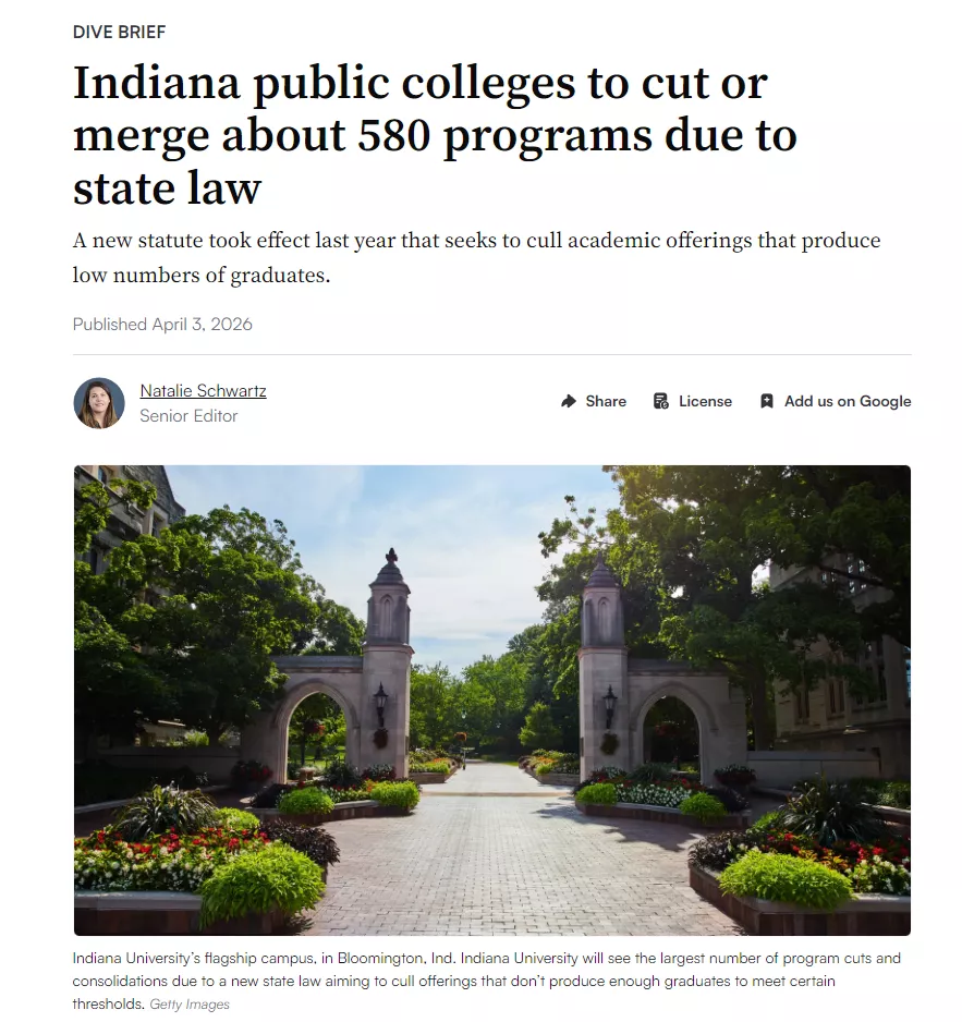 州长MikeBraun表示:高等教育要和未来的工作更紧密地对上,不然学生、家庭、纳税人的投入都很难说得过去。再配上新规里的硬门槛:副学士至少10人毕业、学士15人、硕士7人、博士3人,达不到的,就会被盯上。