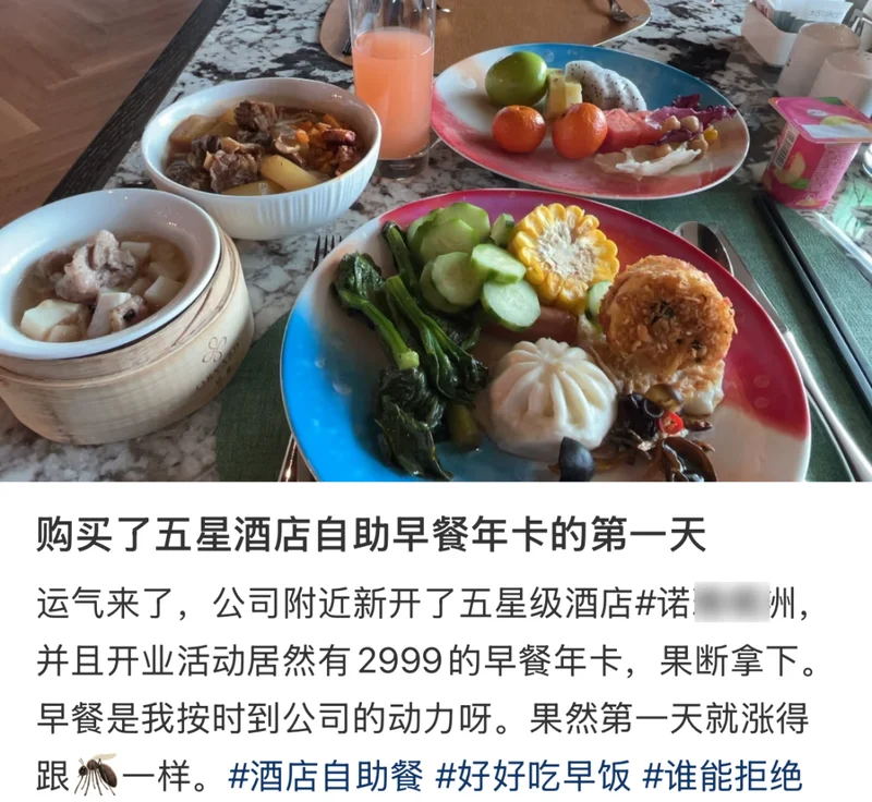 最贵的1万元年卡,虽说看起来吓人,可按照365天换算,相当于每顿早餐只要30元;更有人挖到了新开业的五星酒店,早餐年卡不过2999元,“岂不是吃一餐,只花几块钱就行。”