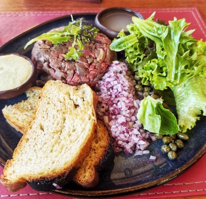 傍晚说吃点东西还要赶路,所以拿了菜单赶紧点。西语看不懂,就让Meta眼镜从菜单里推荐一个,结果推荐了Tartaro de res con toastadas, 说这道菜里的牛肉特别tender, 配着烤面包非常好吃。就点了,结果上来是这样的: