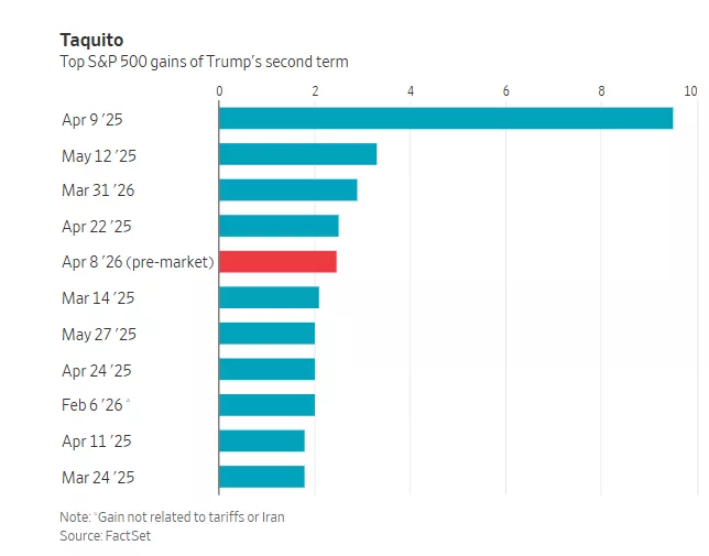 自去年特朗普宣誓就职以来的 300 多个交易日中,标普 500 指数涨幅最大的 10 个交易日里,有 9 个都与关税或伊朗局势缓解有关。 如果投资者只在这些日子持有股票,收益将达到 52%,相比之下,持续持有指数基金的回报只有 12%。