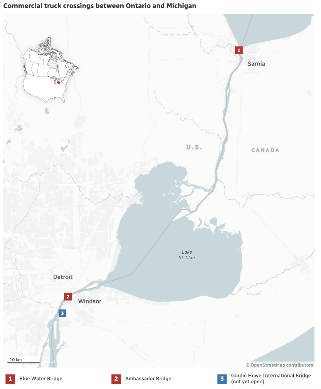 由于大使桥的过路费贵到离谱,大批商业货柜车正选择集体向北绕道。与此同时,备受期待、耗资巨大的戈迪・豪国际大桥(Gordie Howe International Bridge)却陷入了超支和延期的泥潭,让原本脆弱的边境交通雪上加霜。
