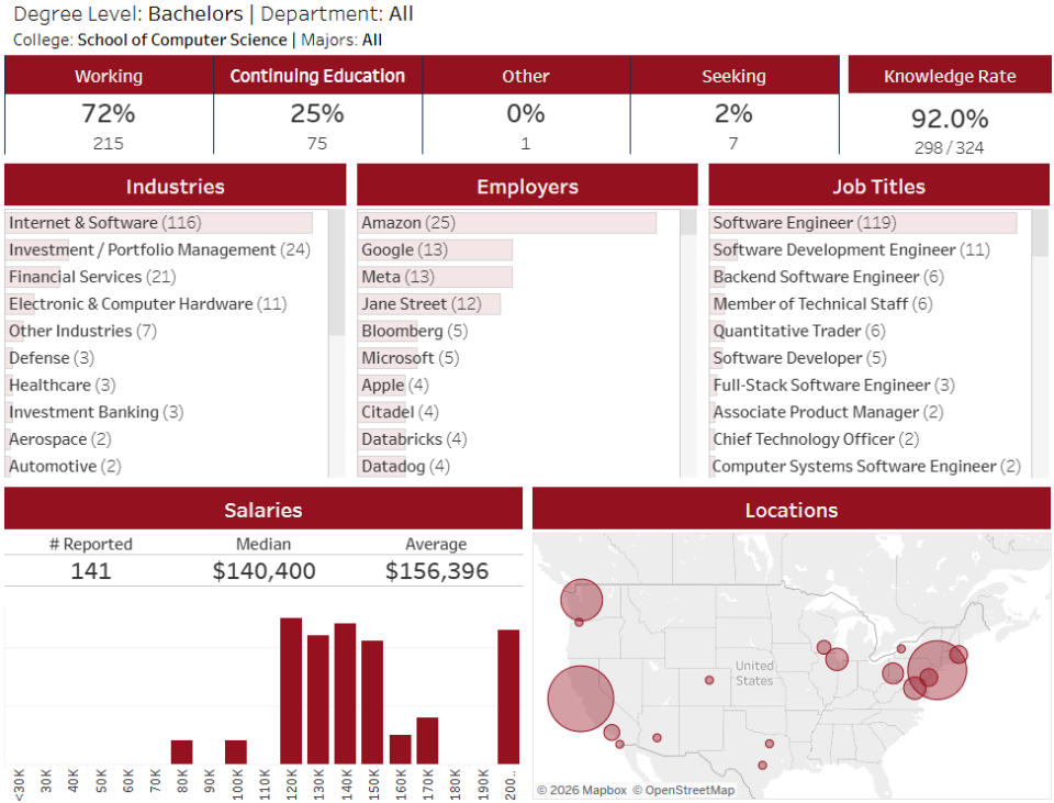大量毕业生直接进入科技行业,雇主名单中经常可以看到Amazon、Google和Meta等大型科技公司。