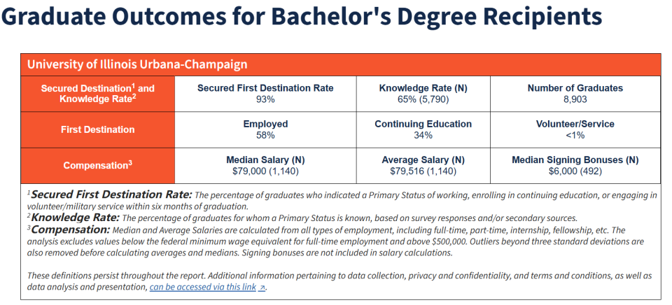 相比之下,UIUC的整体薪资水平更平稳。根据最新发布的Illini Success报告,本科毕业生平均年薪约为79,516美元,中位数为79,000美元。