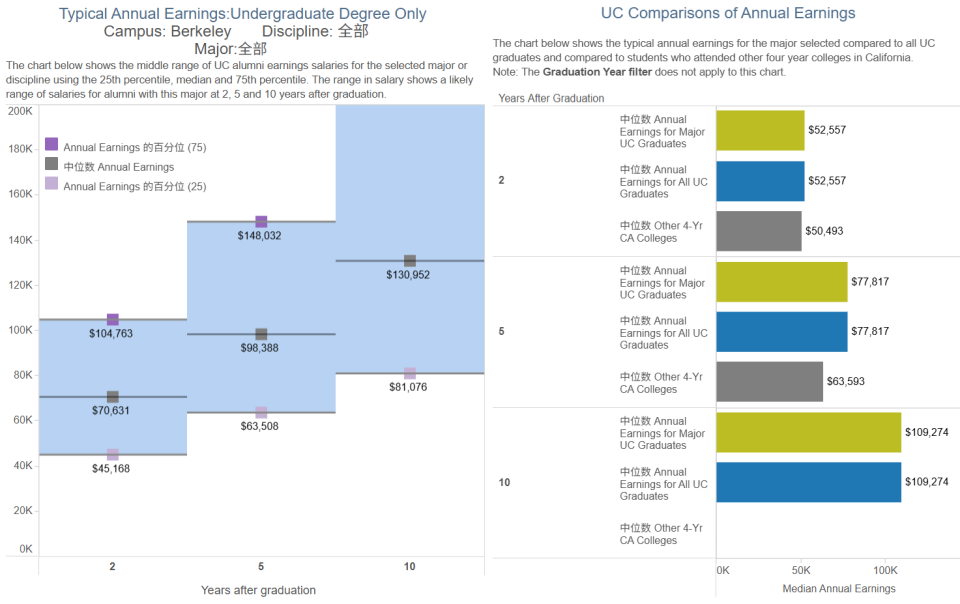 但是UCB校友的收入增长速度非常快,毕业五年后的薪资中位数已经提升到98,388美元,十年后进一步上升到130,935美元。