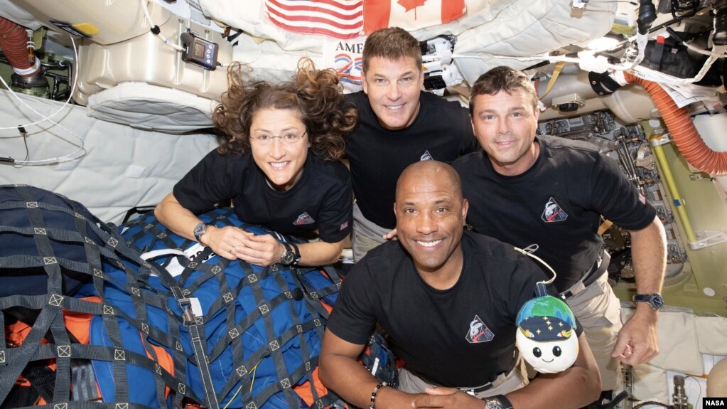阿尔忒弥斯二号任务机组人员(从左起顺时针)克里斯蒂娜·科赫(Christina Koch)、杰里米·汉森(Jeremy Hansen)、里德·怀斯曼(Reid Wiseman)和维克多·格洛弗(Victor Glover) 在猎户座飞船上与他们的零重力指示玩偶“Rise”合影。(2026年4月7日)